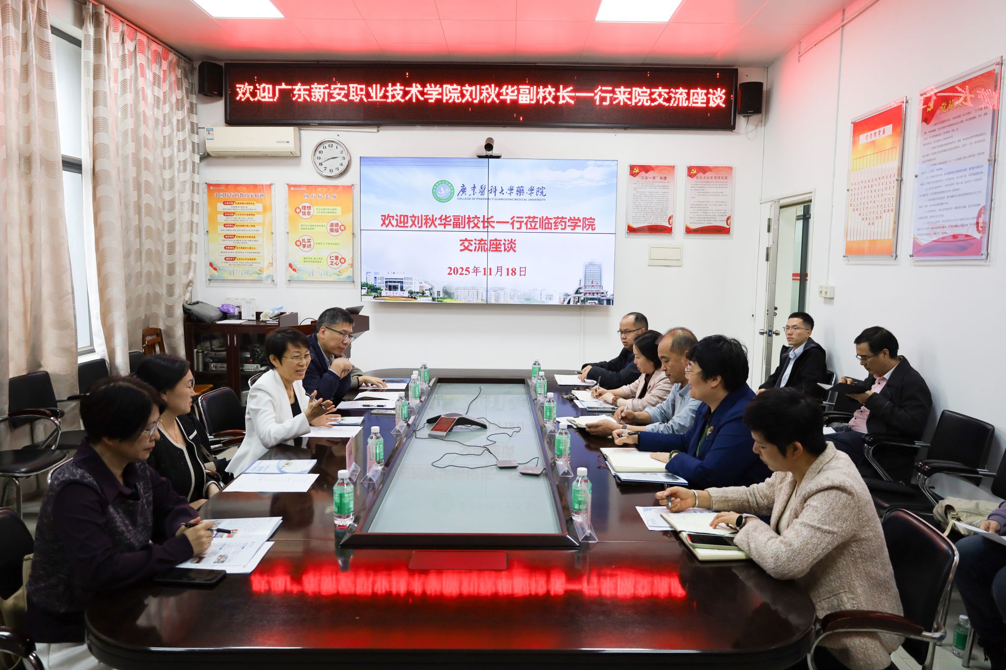 为深化校际合作,共促医药健康领域人才培养与科研发展,11月18日下午,广东新安职业技术学院刘秋华副校长一行到访药学院,双方于513会议室开展座谈交流活动,围绕学科建设、科研平台、教学改革等多个维度展开深入探讨,座谈会由药学院党委书记李宝红研究员主持。