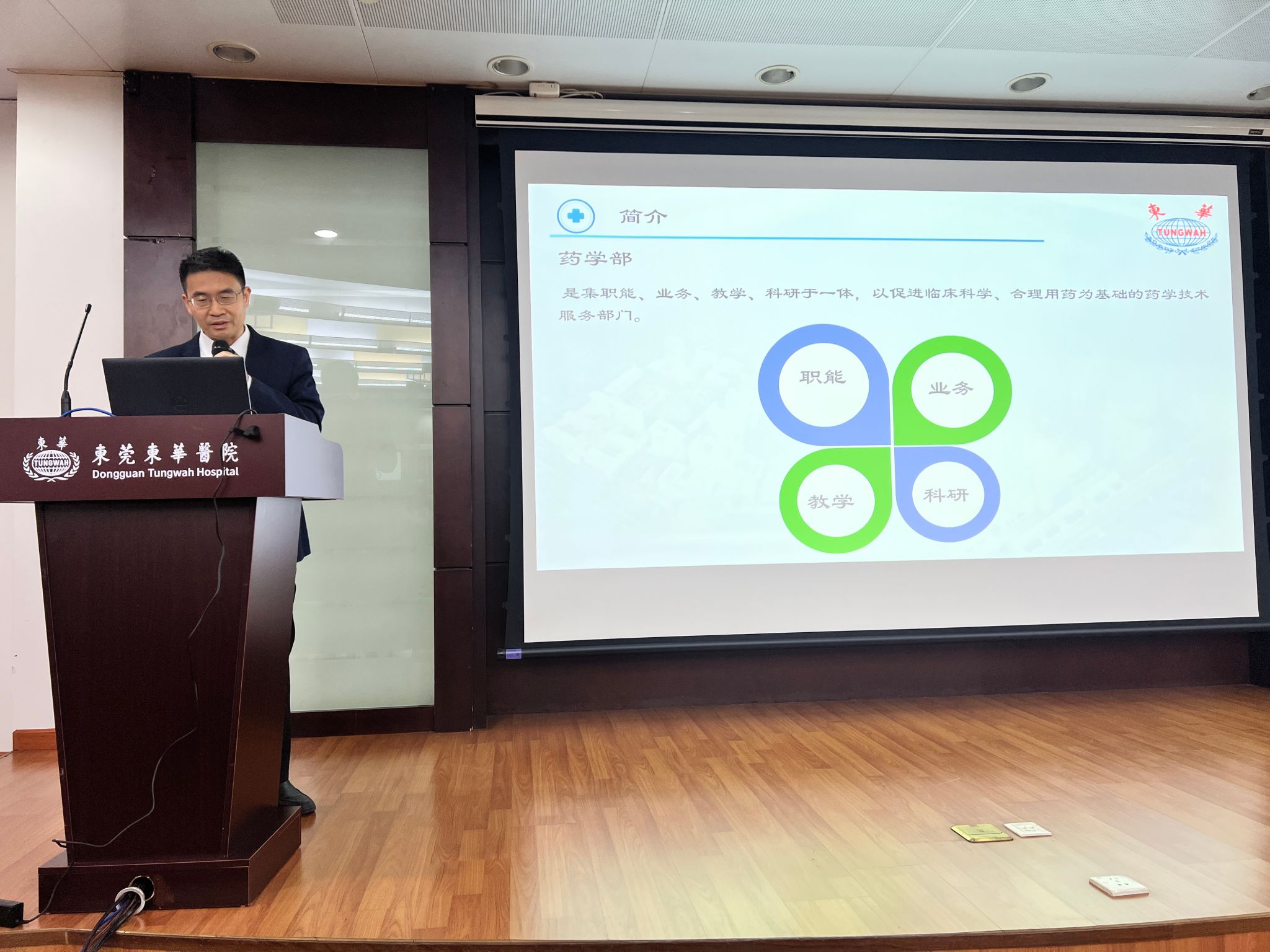 当日上午,师生一行抵达东莞东华医院。东华医院药学部主任顾问王衍洪、药学部主任刘少波、药剂科副主任刘惠强、两院辅导员陈泽冰、杨航老师共同出席活动,王衍洪主任与带队辅导员分别就医院和学院相关概况作介绍。