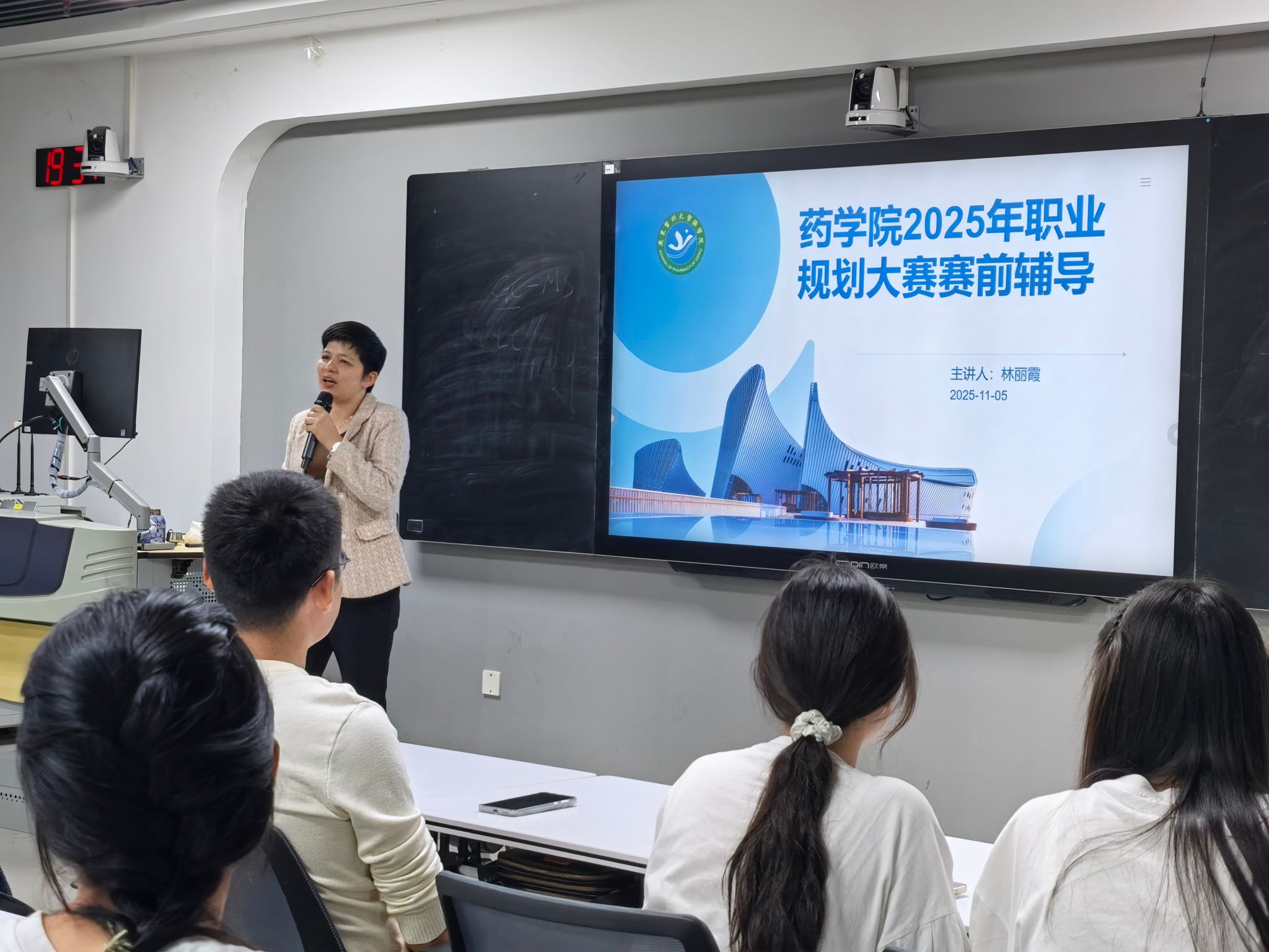 本次大赛在学院的大力推动下,吸引了1800余名药苑学子踊跃参与。为引导学生树立科学的职业发展观、提升作品质量,学院特别邀请GCDF全球职业规划师林丽霞老师开展赛前辅导讲座。
