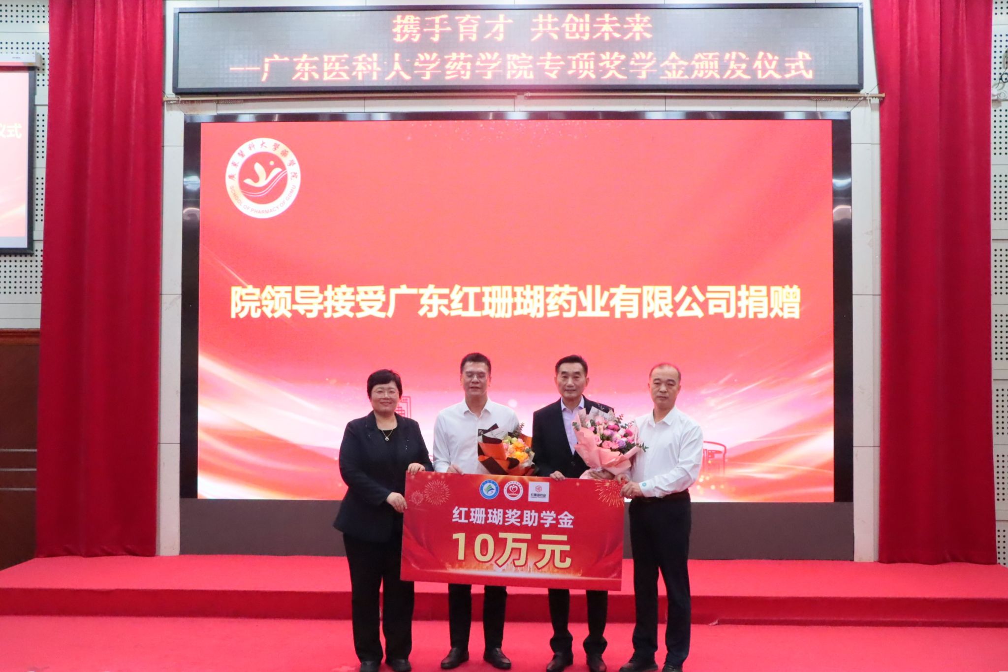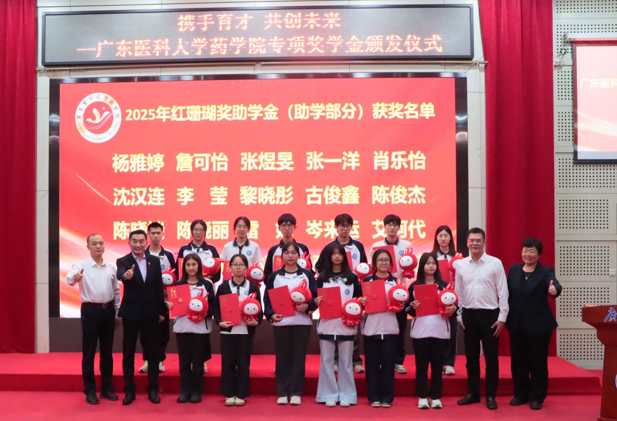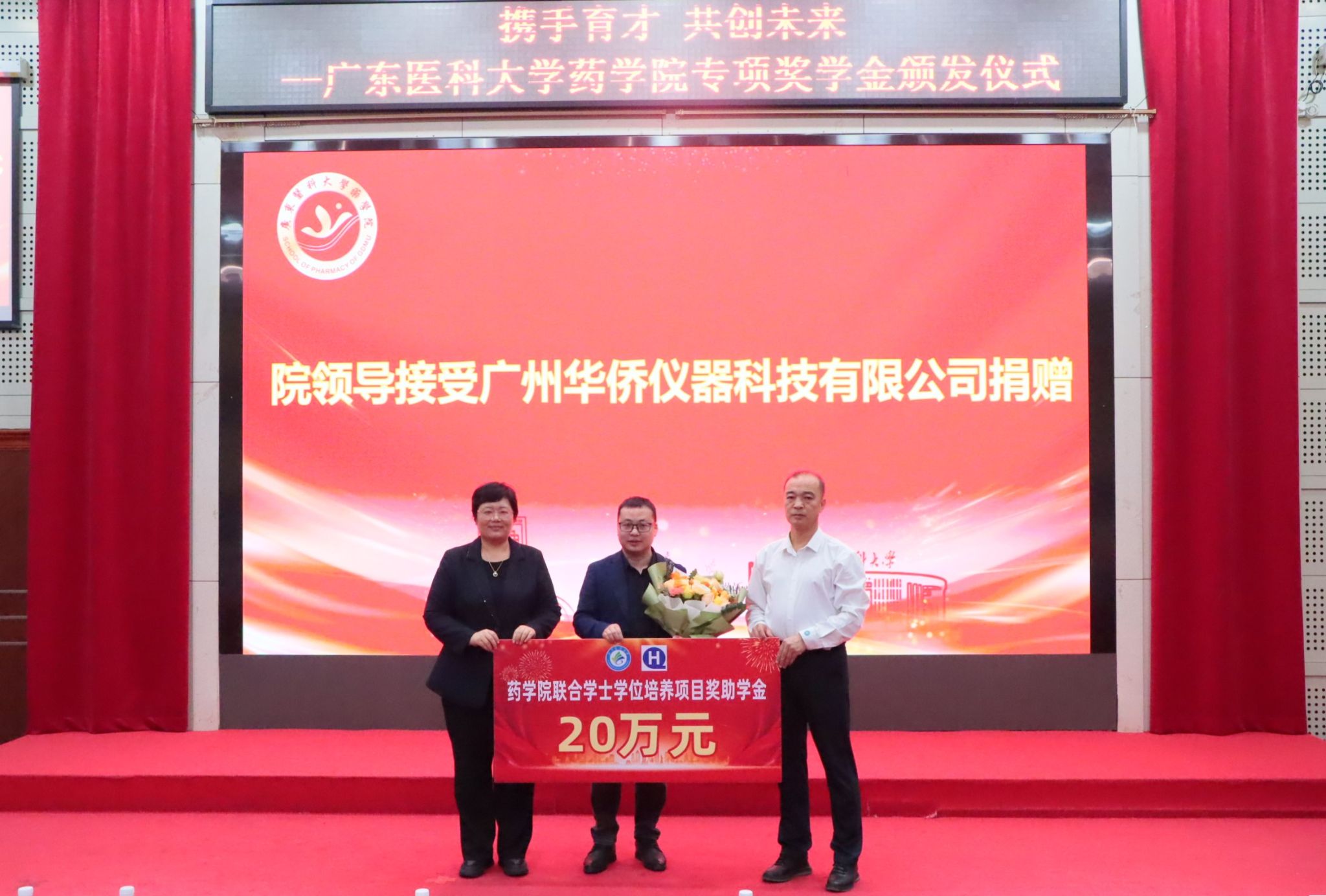12 月 5 日,广东医科大学药学院专项奖助学金颁发仪式在行政楼报告厅顺利举办。东莞松山湖社会事务局局长卢智文受邀出席,广东红珊瑚药业有限公司董事长王中嶽、广州华侨仪器科技有限公司总经理张长玉率领企业代表莅临现场,药学院党委书记李宝红、院长申丽及药学院师生代表共同见证,政企校齐聚,共话育人初心。
