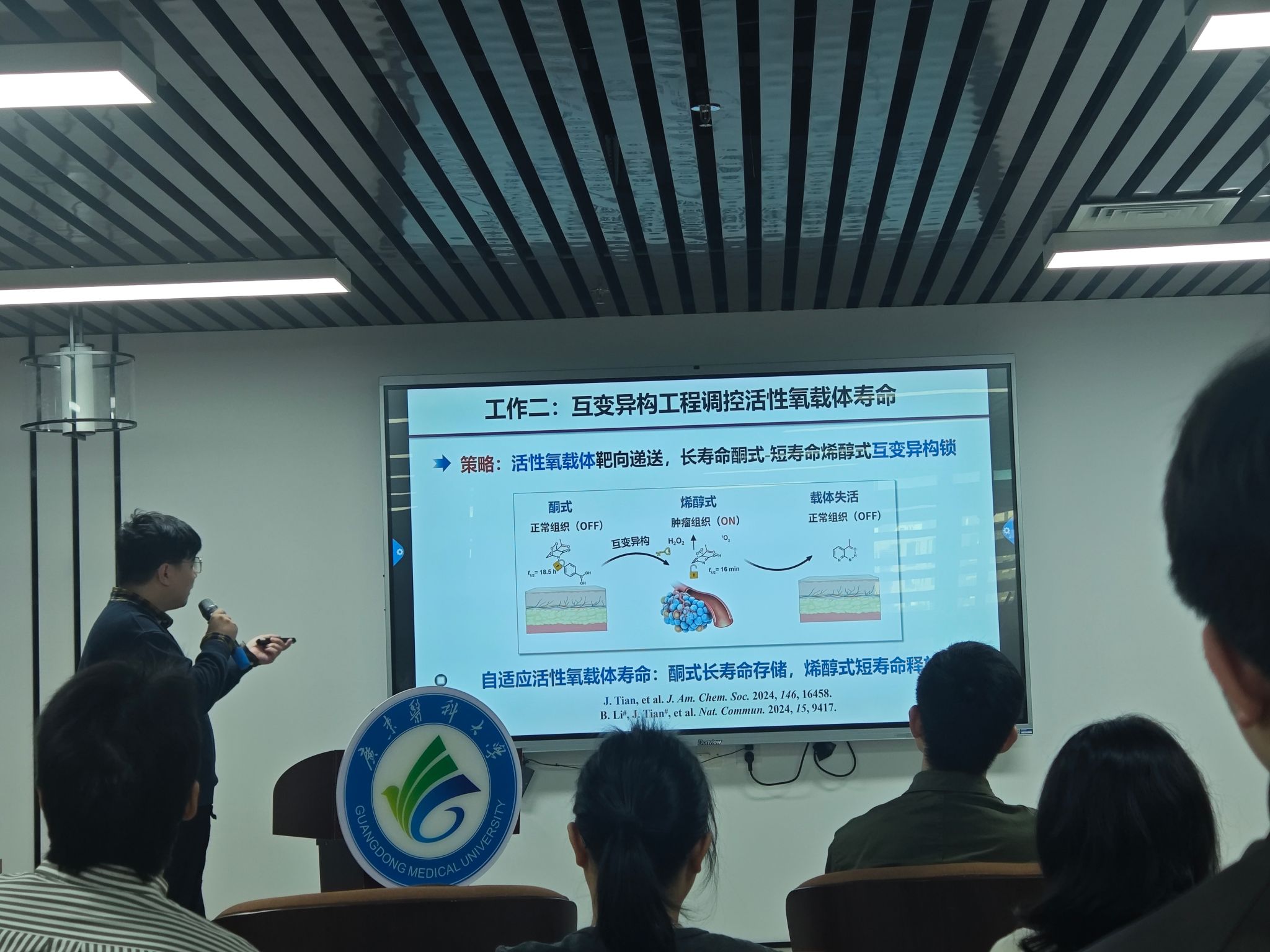交流会上田健吾教授的报告不仅是一场前沿技术的展示,更是一次治疗理念的革新。他所提出的“可编程”与“可控释放”思想,将活性氧治疗从传统的“开环”粗放模式,推进到了“闭环”智能精准的新范式。这场精彩的分享极大地拓宽了在场师生,尤其是在生物医学、药学及化学交叉领域研究者的科学视野,激发了大家对“智能药物”设计的全新思考,为广东医科大学的学术氛围注入了强劲的跨学科创新活力。报告结束后,现场师生就分子设计细节、动物实验验证及未来临床转化路径等与田教授进行了深入而热烈的探讨。