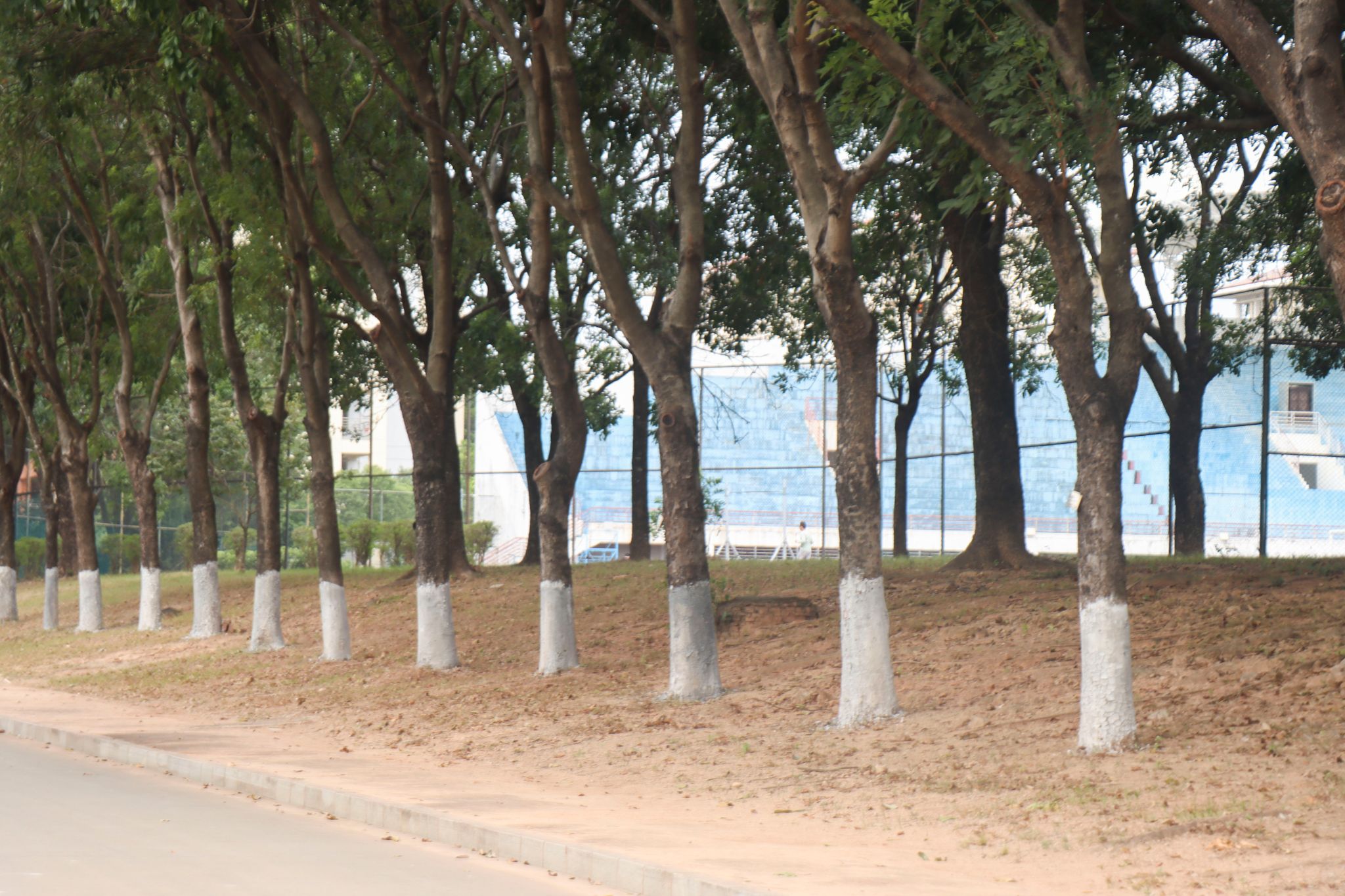 总务后勤部技术人员穿梭其间,手把手指导调整涂刷角度与力度,及时纠正不规范操作,保障每棵树木都得到专业防护。粗糙的树干渐次换上匀白 “冬日新装”,萧瑟枝桠增添生机暖意,志愿者的身影与草木相映,构成校园里靓丽的志愿风景线。