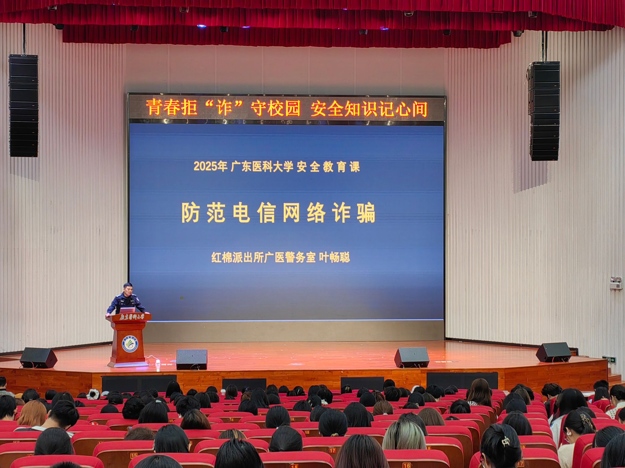 为进一步提升师生防范电信网络诈骗意识,筑牢师生财产安全防线。11月14日,药学院联合红棉派出所广医警务室成功举办防诈骗安全宣讲会。活动特邀叶畅聪警长担任主讲嘉宾,通过案例剖析、风险预警与策略指导相结合的方式,为全院师生带来了一堂专业、深刻的防诈骗教育课。